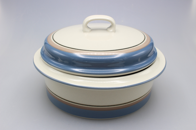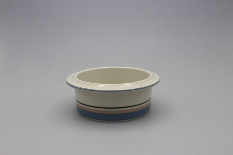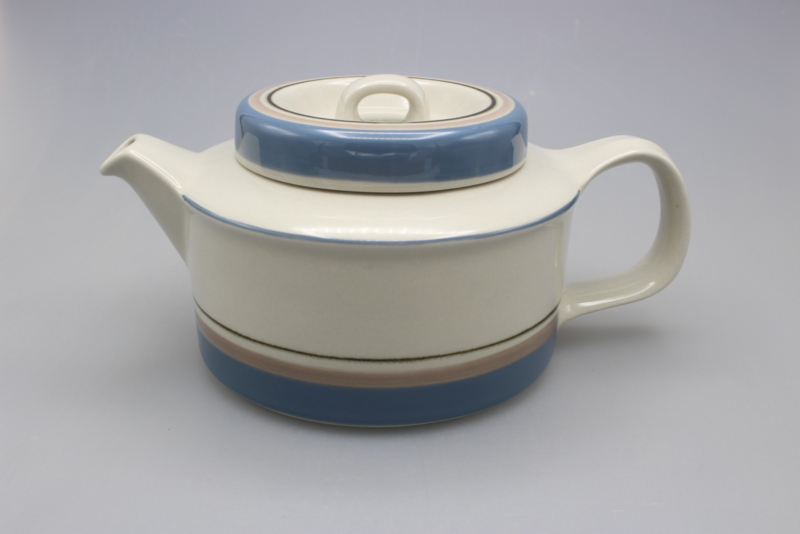 The basic shape of UHTUA, designed by Ulla Procopé, is fitted with a taut decoration of rings by Inkeri Leivo. The great quality of the shape is emphasized by the blue-brown tone of the decoration against the grey background. Uhtua was manufactured by Arabia from 1982 up till 1999.